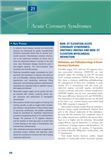 elevation has high localizing value (Table 21-1). The typical ST elevation seen with STEMI has an outward convexity. The ST segment eleva- tions usually return to baseline with myocardial reperfusion and can be used to monitor rep- erfusion therapies. The differential diagnosis includes hyperkalemia, acute central nervous system (CNS) injury, acute myocarditis, acute pericarditis, left ventricular hypertrophy, api- cal cardiomyopathy, Wolff–Parkinson–White syndrome, early repolarization abnormalities, and LV aneurysm. Some of these may mimic an AMI and hence have been termed “pseudo- infarct” patterns. 2. Evolution of ECG Changes: A series of repolarization changes are seen on ECG after complete coronary artery occlusion. The first transient abnormalities seen are the hypera- cute T waves (tall, peaked, and symmetrical T waves). Hyperacute T waves are usually gone by the time of initial presentation for emer- gency care. This is followed by convex, upward ST elevation, which is a sign of transmural myocardial ischemic injury. The number of leads showing the abnormality has a bearing on the size of the infarction and prognosis. T wave inversions are seen with persistent transmural ischemia. By this time, the ST elevations have begun to subside. Q waves are a sign of com- pletion of the infarction and may take hours to days to develop. Persistent ST elevation beyond 3 to 4 weeks is a sign of an LV aneurysm. 3. Posterior MI: This manifests as ST depres- sion (>2 mm) in leads V 1 to V 3 . It is usually seen in conjunction with an inferior wall MI, Table 21-1. Anatomic Patterns of Myocardial Injury Location of Injury Affected Leads Inferior II, III, F Anterior/septal V 2 –V 4 Anterolateral V 3 –V 6 Lateral I, AVL, occasionally V 6 Apical II, III, F, V 5 , V 6 Posterior a V 1 and V 2 and V 3 R, V 4 R a ST segment depression with R waves; T wave is inverted initially and then becomes upright.